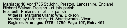 Marriage: 16 Apr 1785 St John, Preston, Lancashire, England