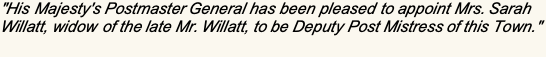 "On Friday last died Mr. John Willatt, Postmaster in this town, second to none in this part of the Kingdom in the knowledge of his profession ; he discharged it with a diligence and impartiality which rendered him beloved and respected by all ; benevolent and sociable in his disposition, he was esteemed by those who knew him, as a sincere friend and an honest man, and as a kind husband and a tender parent, his death is much lamented by a wife and four children."
