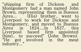 "shipping firm of Dickson and Montgomery had a man named John Brown, representing them in Buenos Aires... (His) brother.. went to Liverpool to work for Dickson and Montgomery, and moved to Buenos Aires in 1824....In 1827, this Liverpool based firm appointed (him).. to succeed" (John Brown). "He got involved in the meat industry..."