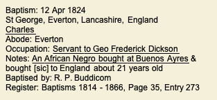 Getauft wurde, etwas später, auch der 21jährige schwarze Diener Charles, in Buenos Aires noch als Sklave gekauft, später vermutlich freigelassen (im Britischen Empire wurde der Sklavenhandel im Jahr 1807 verboten, die Sklaverei selbst aber erst 1833; siehe unten).