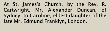 "DUNCAN - June 4 at the residence of her son-in-law Andrew Broad, Wynola, Croydon. Caroline, relict of the late Alexander Duncan of Glasgow, Scotland, aged 69 years."