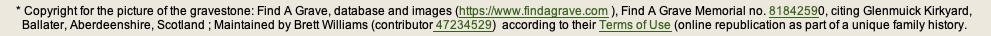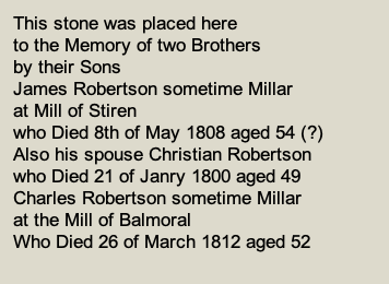 There is a further clue: the table stone at Ballater says that James had a brother Charles Robertson, who became miller at “Mill of Balmoral”. The stone was made after Royalty had moved in and made Balmoral famous; but the church of Balmoral is Crathie. Di Halmarick says Charles married Margaret Blair and they had two children, baptised 1790 and 1795.