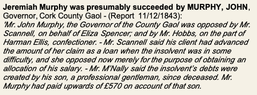 that Jeremiah Murphy governed "Cork Gaol for more than 50 years, then he must have been at least 70 at the time of his death, and probably older pulling his birth date before 1750. His brother seems to have been called John; they signed themselves 'Jeremiah & John Murphy, Keepers, County Gaol Cork' in a letter.