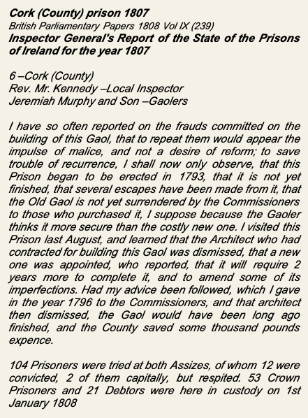 While Jeremiah Murphy served as governor of Cork (county) gaol a new gaol building was planned (see below the "Inspector General's Report" about the delay of completion and the difficulties during the building process). It was finally completed in 1819 (see left). The architect was the famous