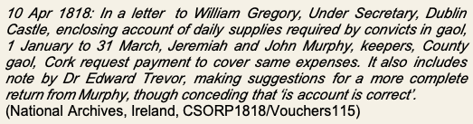 10 Apr 1818: In a letter to William Gregory, Under Secretary, Dublin Castle, enclosing account of daily supplies required by convicts in gaol, 1 January to 31 March, Jeremiah and John Murphy, keepers, County gaol, Cork request payment to cover same expenses. It also includes note by Dr Edward Trevor, making suggestions for a more complete return from Murphy, though conceding that ‘is account is correct’.
