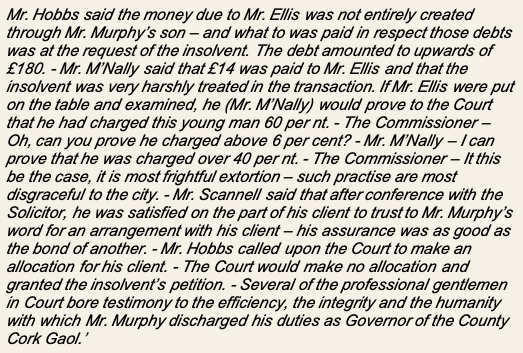 Mr. Hobbs said the money due to Mr. Ellis was not entirely created through Mr. Murphy’s son – and what to was paid in respect those debts was at the request of the insolvent. The debt amounted to upwards of £180. - Mr. M’Nally said that £14 was paid to Mr. Ellis and that the insolvent was very harshly treated in the transaction. If Mr. Ellis were put on the table and examined, he (Mr. M’Nally) would prove to the Court that he had charged this young man 60 per nt. - The Commissioner – Oh, can you prove he charged above 6 per cent? - Mr. M’Nally – I can prove that he was charged over 40 per nt. - The Commissioner – It this be the case, it is most frightful extortion – such practise are most disgraceful to the city. - Mr. Scannell said that after conference with the Solicitor, he was satisfied on the part of his client to trust to Mr. Murphy’s word for an arrangement with his client – his assurance was as good as the bond of another. - Mr. Hobbs called upon the Court to make an allocation for his client. - The Court would make no allocation and granted the insolvent’s petition. - Several of the professional gentlemen in Court bore testimony to the efficiency, the integrity and the humanity with which Mr. Murphy discharged his duties as Governor of the County Cork Gaol.’