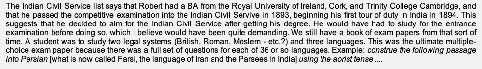 The Indian Civil Service list says that Robert had a BA from the Royal University of lreland, Cork, and Trinity College Cambridge, and that he passed the competitive examination into the Indian Civil Servive in 1893, beginning his first tour of duty in India in 1894. This suggests that he decided to aim for the Indian Civil Service after getting his degree. He would have had to study for the entrance examination before doing so, which I believe would have been quite demanding. We still have a book of exam papers from that sort of time. A student was to study two legal systems (British, Roman, Moslem - etc.?) and three languages. This was the ultimate multiple- choice exam paper because there was a full set of questions for each of 36 or so languages. Example: