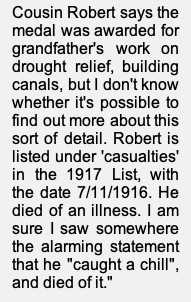Cousin Robert says the medal was awarded for grandfather's work on drought relief, building canals, but I don't know whether it's possible to find out more about this sort of detail. Robert is listed under 'casualties' in the 1917 List, with the date 7/11/1916. He died of an illness. I am sure I saw somewhere the alarming statement that he "caught a chill", and died of it."