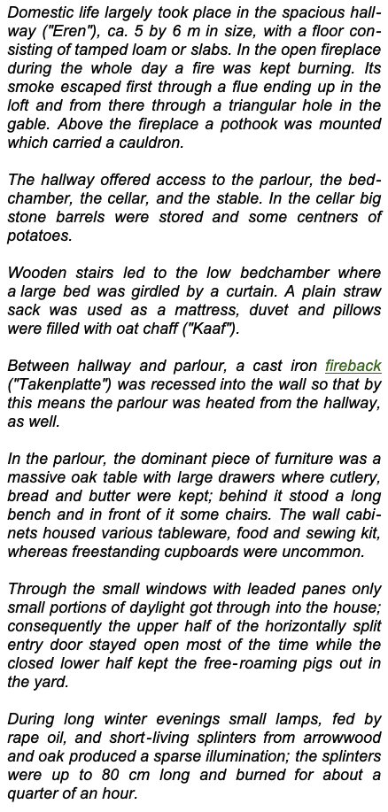 It was very homely when our big room was lighted from that little lamp and the women sat at the spinning wheels and somebody told unearthly tales about ghosts. The success was that all the children were afraid of darkness and at last only my father stayed courageous enough to go outside into the dark on his own. But what we did together, as well, was singing many of the old folk songs, what especially delighted my father. The women span linen, flax, hemp and the wool. My sisters wove the linen on their own looms.